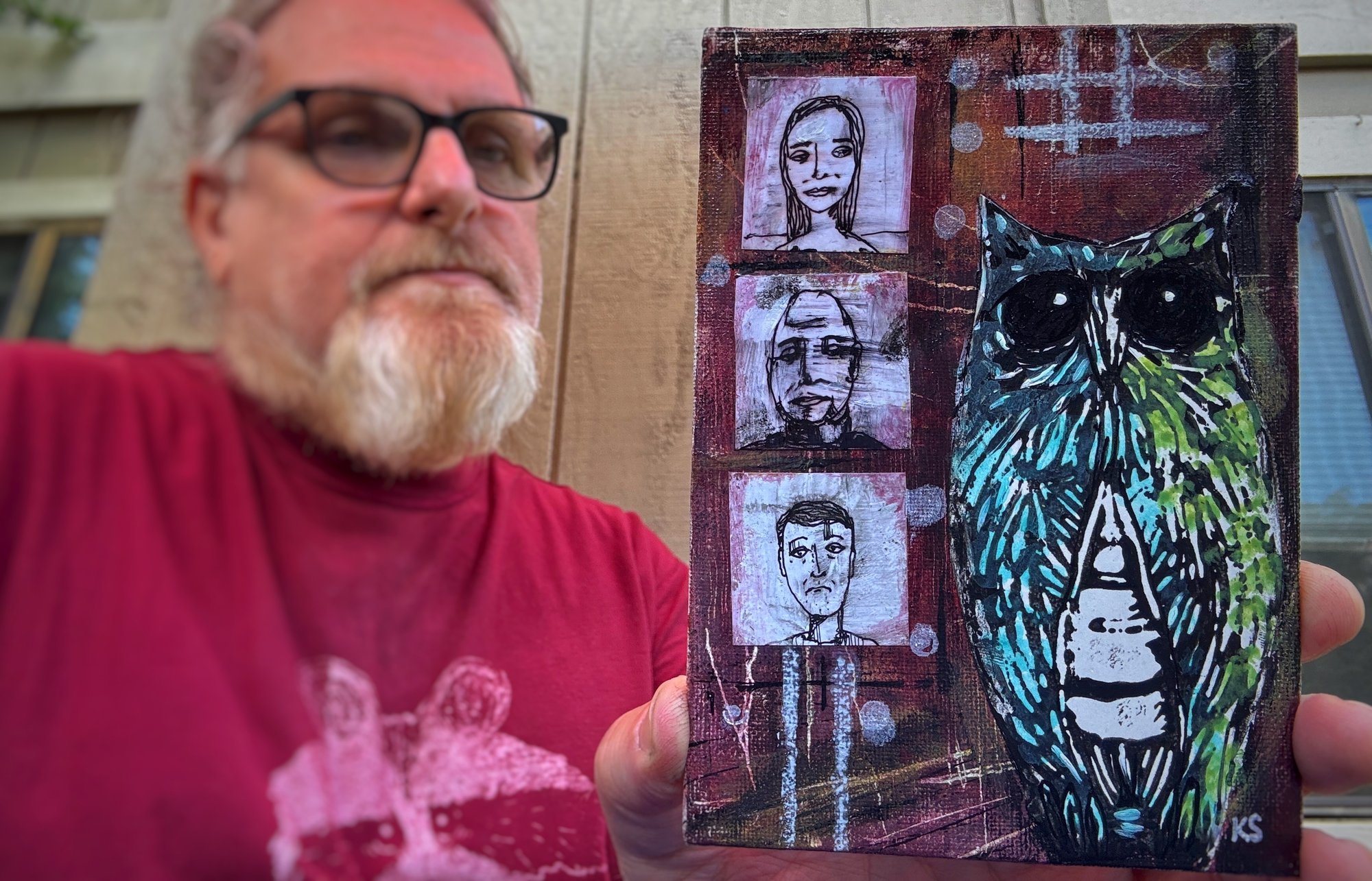 Acrylic, ink, collage on canvas panel.
