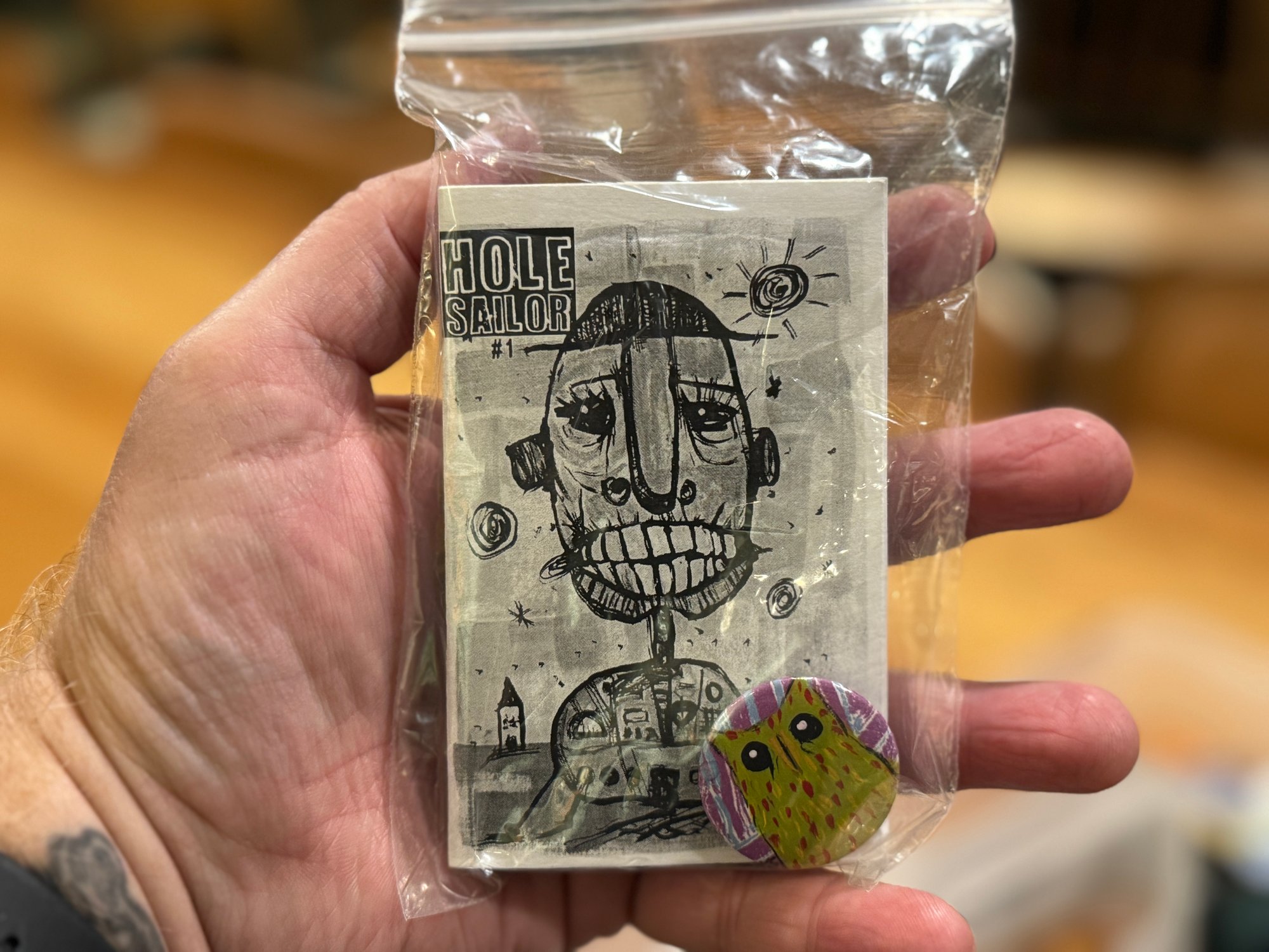 3 2"x4" acrylic on canvas panel owl paintings, along with a copy of the debut issue of Hole Sailor, my free verse poetry mini-zine and a handmade button.