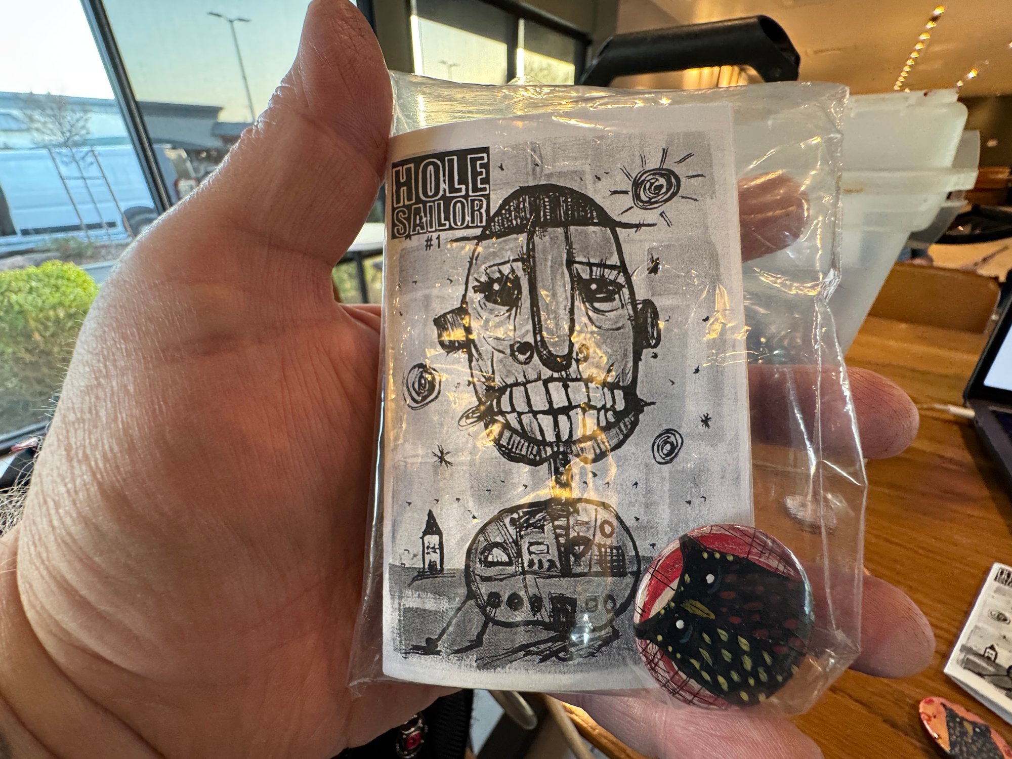 3 2"x4" acrylic on canvas panel owl paintings, along with a copy of the debut issue of Hole Sailor, my free-verse poetry mini-zine and a handmade button.