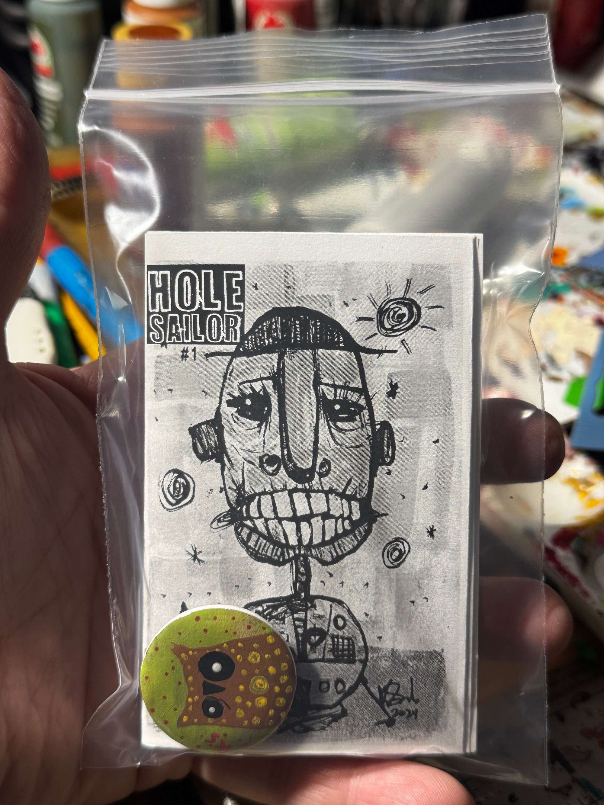 3 2"x4" acrylic-on-canvas panel owl paintings, along with a copy of the debut issue of Hole Sailor, my free-verse poetry mini-zine, and a handmade button.