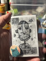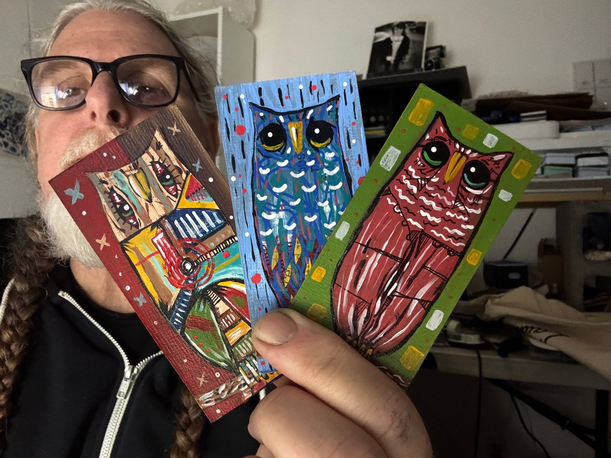 3 2"x4" acrylic-on-canvas panel owl paintings, along with a copy of the debut issue of Hole Sailor, my free-verse poetry mini-zine, and a handmade button.
