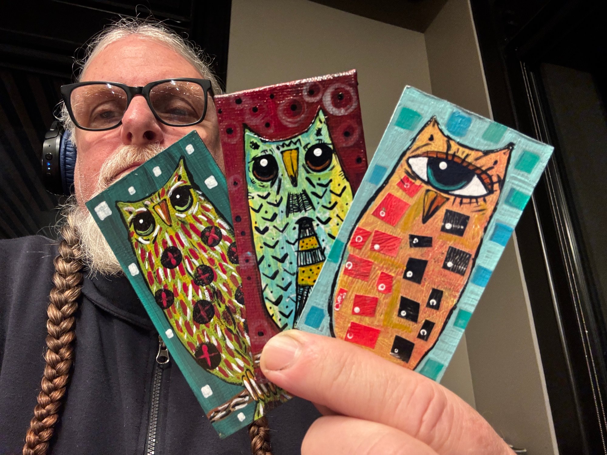 3 2"x4" acrylic-on-canvas panel owl paintings, along with a copy of the debut issue of Hole Sailor, my free-verse poetry mini-zine, and a handmade button.
