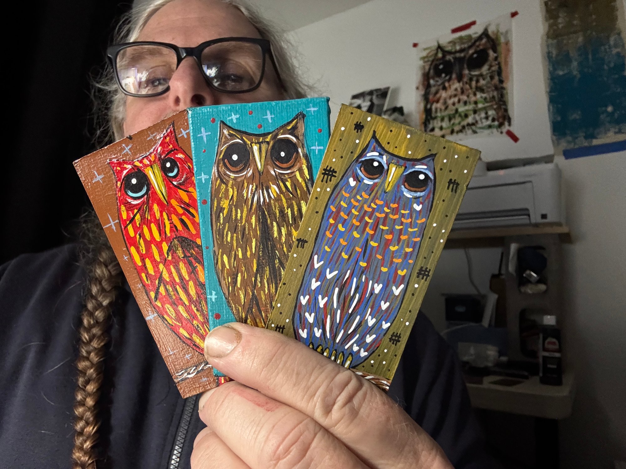 3 2"x4" acrylic-on-canvas panel owl paintings, along with a copy of the debut issue of Hole Sailor, my free-verse poetry mini-zine, and a handmade button.