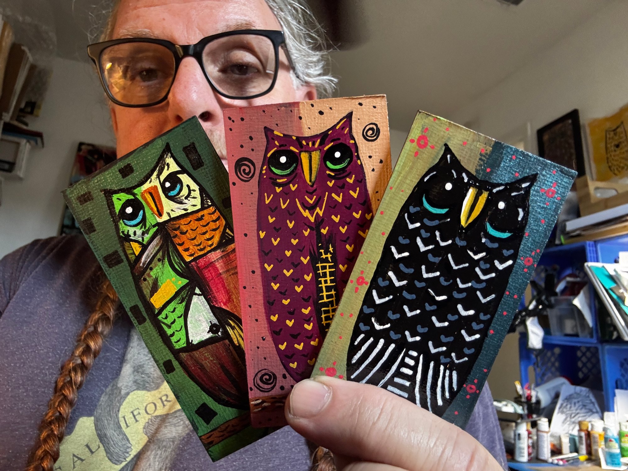 3 2"x4" acrylic-on-canvas panel owl paintings, along with a copy of the debut issue of Hole Sailor, my free-verse poetry mini-zine, and a handmade button.