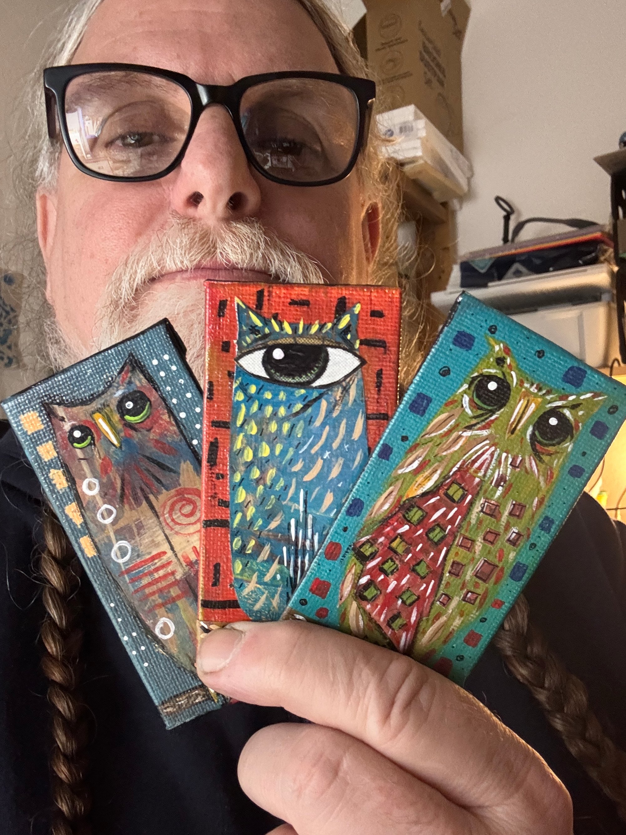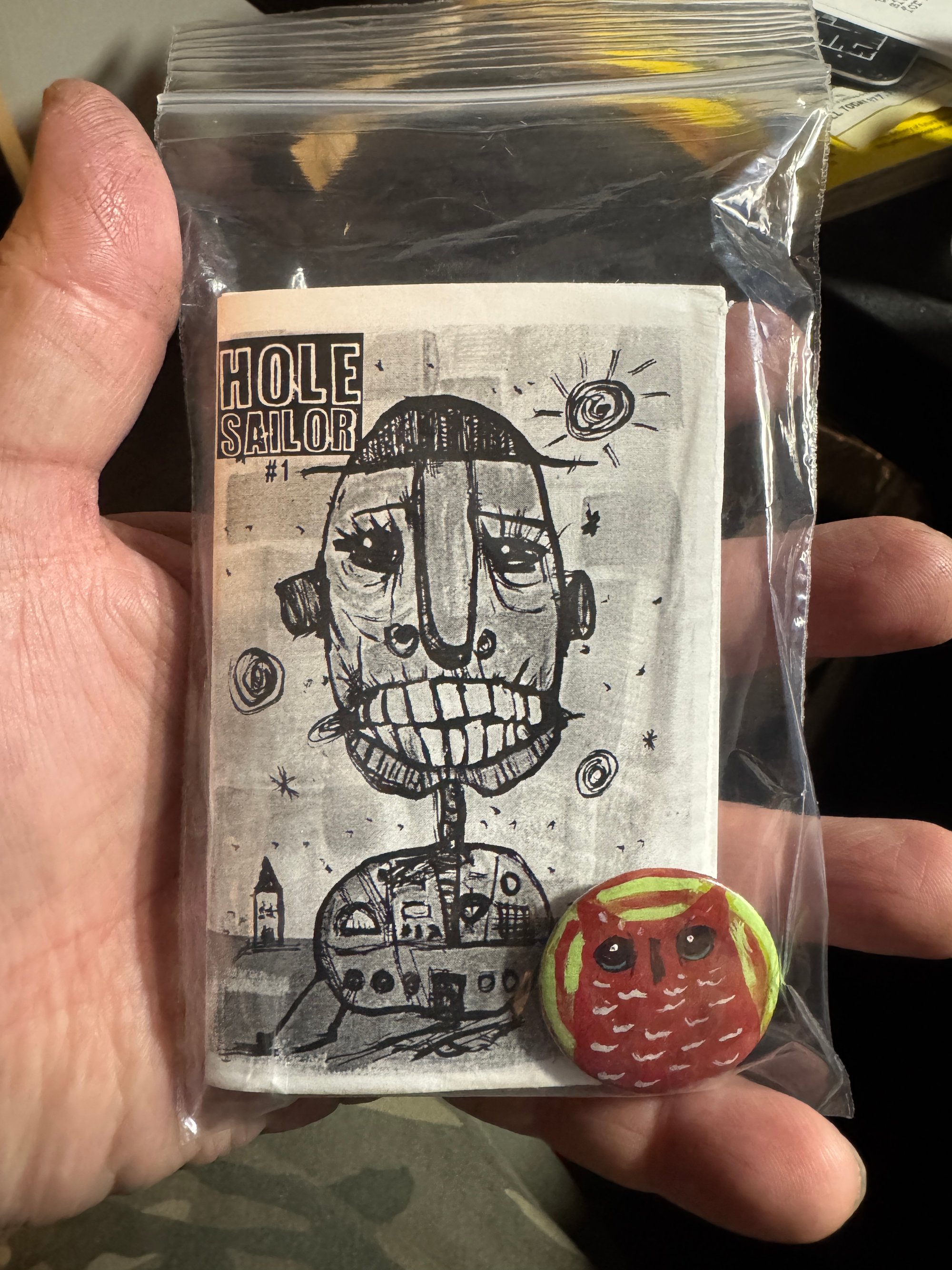 3 2"x4" acrylic on canvas panel owl paintings, along with a copy of the debut issue of Hole Sailor, my free verse poetry mini-zine and a handmade button.