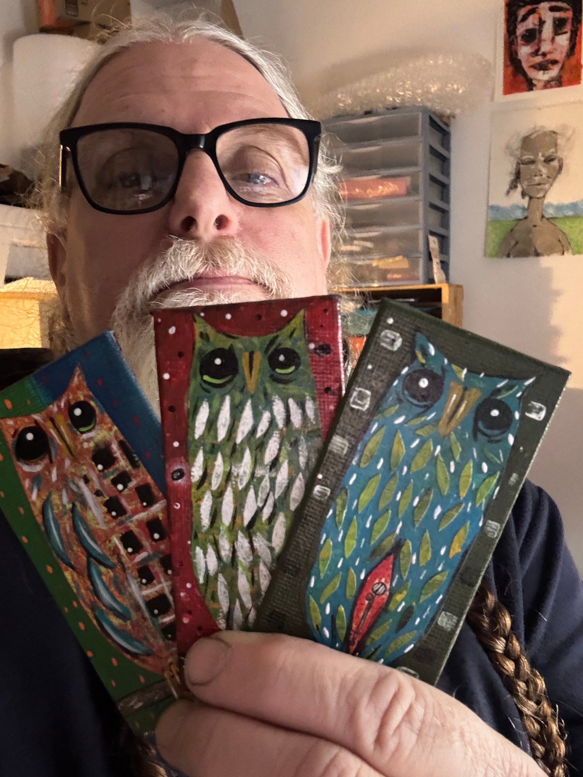 3 2"x4" acrylic on canvas panel owl paintings, along with a copy of the debut issue of Hole Sailor, my free verse poetry mini-zine and a handmade button.